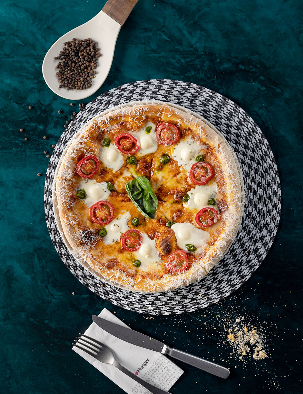 Domates sos, domates, siyah zeytin dilimleri, fesleğen ve roka yaprakları.
