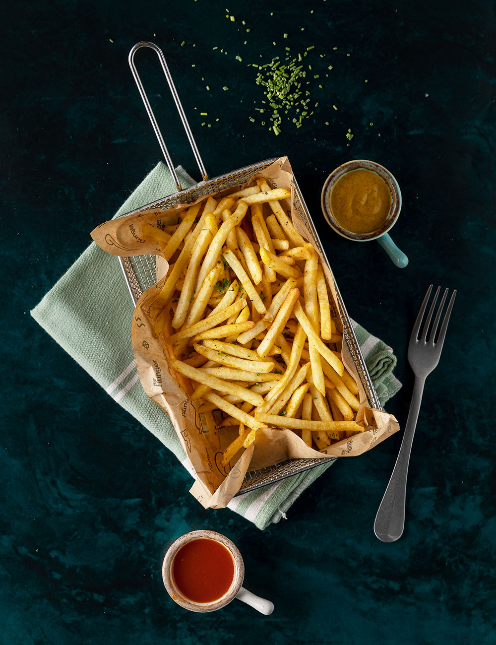 Corn dog hamuru ile kaplanmış kokteyl dana sosis, kibrit patates, yeşil soğan, ketçap, mayonez, hardal.