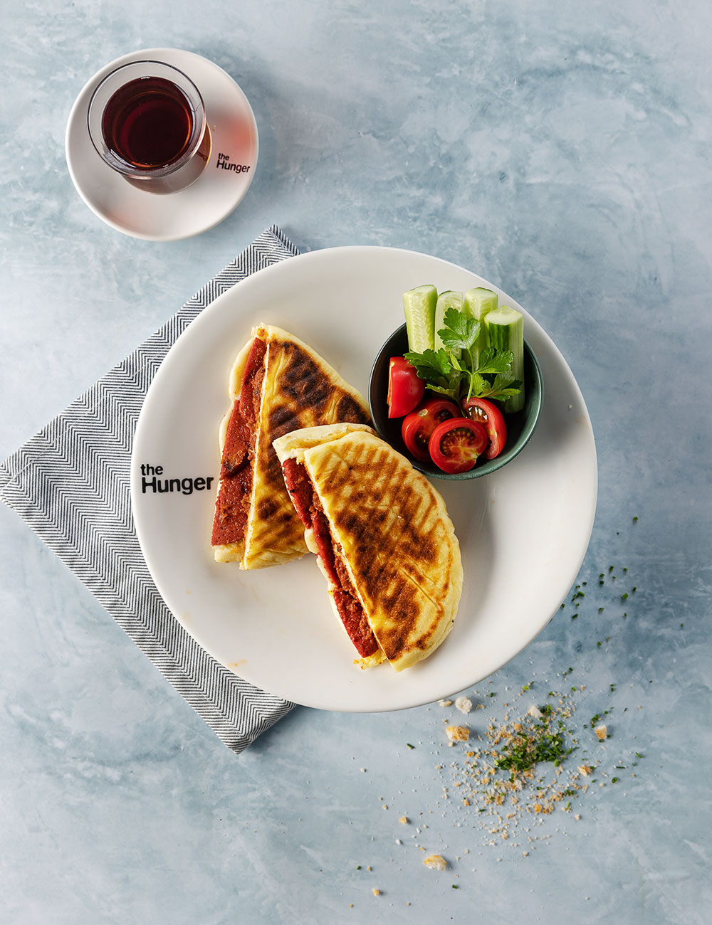 Çapata ekmeğinde dil peyniri, kaşar peyniri, cheddar peyniri, zeytin ezmesi, domates-salatalık söğüş.