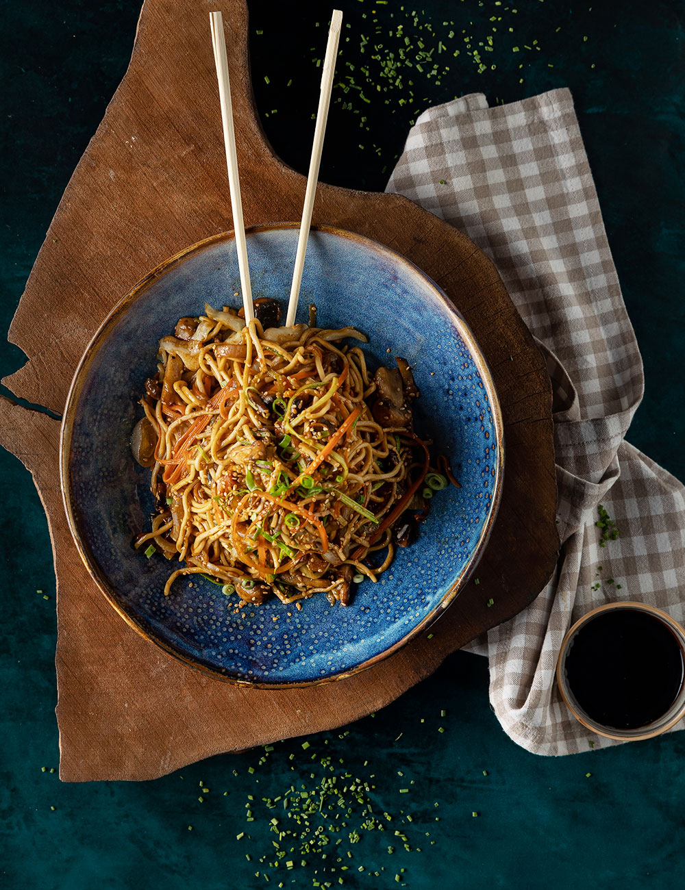 Renkli biberler, soğan, mantar, soya sos, gratine edilmiş kaşar peyniri, baharatlı patates tava, akdeniz yeşillikleri.