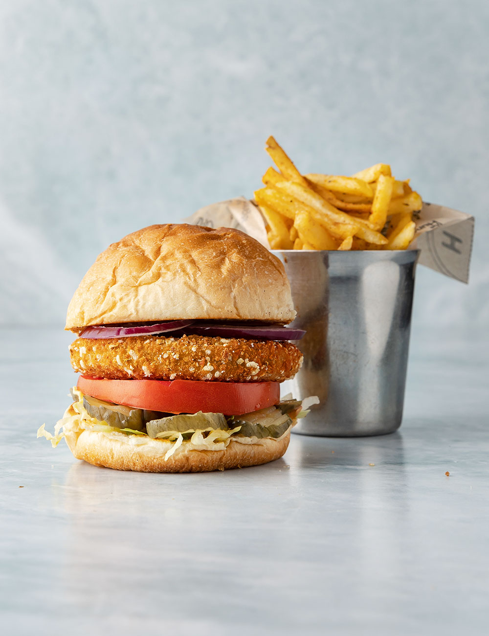 Kızarmış tavuk göğüsü, coleslaw, heinz classic burger sos, suda mozzarella, hunger chili sos, barbekü sos, baharatlı patates tava