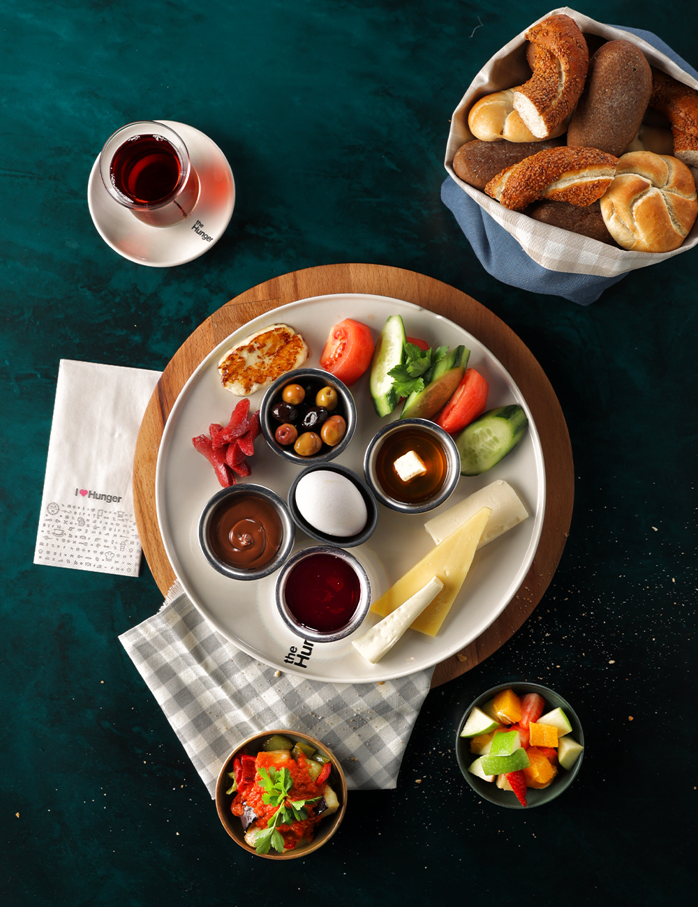 Ezine peyniri, eski kaşar, dil peyniri, ızgara hellim, haşlanmış yumurta, mevsim meyveleri, sosis, bal, reçel, tereyağ, taze otlar, yeşil ve siyah zeytin, domates, salatalık, nutella, şakşuka, kahvaltı saatleri içerisinde sınırsız demleme çay.