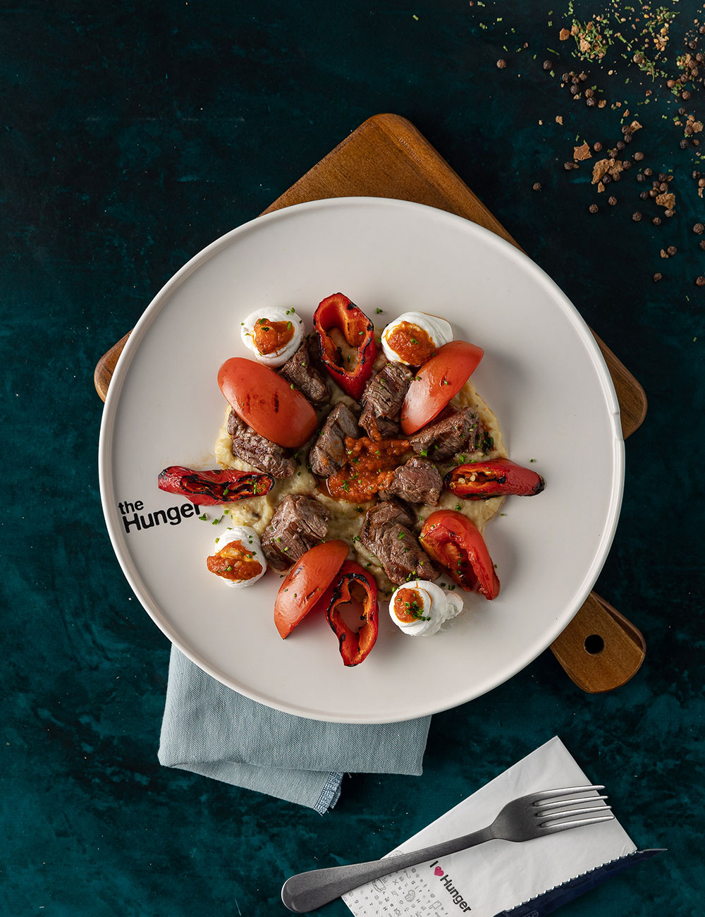 Ağır ateşte pişmiş BBQ soslu tiftiklenmiş dana eti, acılı domates-sour cream sos, mozarella peyniri, yeşil soğan, jalapeno biberi, siyez bulguru.